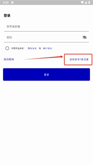 2、打开软件进入界面,要是已有账号,就输入账号密码登录;要是没有账号,就点击“去注册”选项。