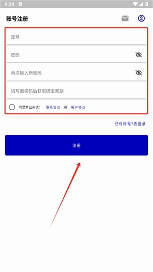 3、依次输入账号、密码等相关信息,点击同意相关协议,随后点击“注册”按钮,即可完成注册流程。