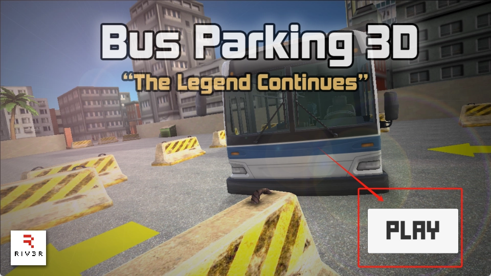 1、当看到“Bus Parking 3D”标题后,点击右下角红色框内的“PLAY”按钮,即可开始。