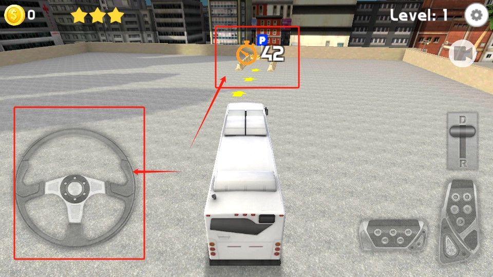 3、用左下方向盘控制大巴,在42秒内停到P标志位置。