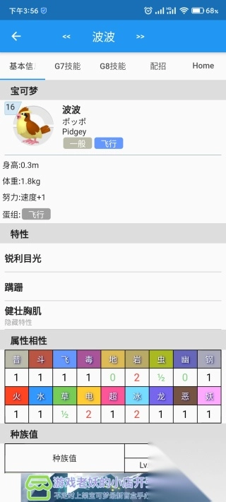 我们以“波波”为例,点击波波,可以看到波波的详细技能,下拉可查看详细信息,特性、蛋组、种族值以及进化链