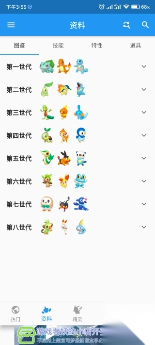 查询的方法用很多种,最基础的是按世代查询,每个世代标题处会有当代御三家的图片,方便辨识