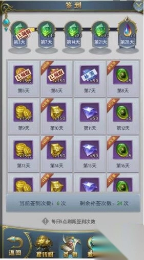 最后每天按时签到也能得到金币奖励,万一忘记了也没关系,我们可以使用钻石来进行补签,一样可以领奖励。在排行榜的膜拜大神中,每天点击一下膜拜就可以获得50万金币,一定不要忘了哦。