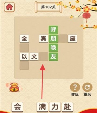 3、第102关,从下方选择合适的字填入空格,组成成语以完成答题。