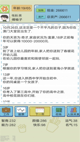 1、关注初始属性,魅力值高的人适宜踏上“社交路线”,智力达标的玩家能够优先考虑科技研发或炒股的途径,体力健硕者则可率先进入蓝领行业,获取第一桶金。