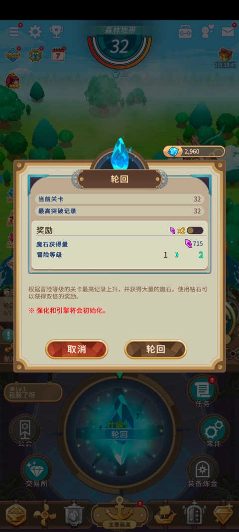 11、在主要画面的下方,有一个十分醒目的蓝色水晶标识,其代表着轮回功能。通过这个轮回功能,你当前角色的等级、飞艇的强化状态等所有相关设定都会被重置为初始状态,让你重新回到起点。此后,你可以去挑战更高级的怪物,获取更优质的资源,进而再次对角色和飞艇进行强化、升级以及升星操作。