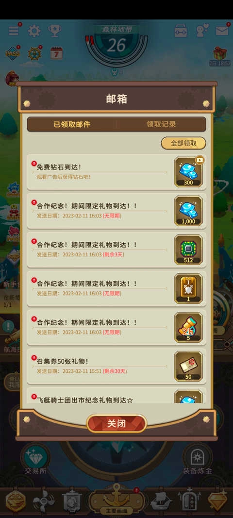 10、再看最右边的信封图标,里面包含每日登录、游戏系统活动等赠送的资源。要是玩家不想逐个领取,这里设有一键全部领取的按钮,用户体验相当不错!