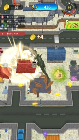 摧毁建筑物能够为你积累积分,积分数值越高,恐龙的体型便会随之增大,这直观体现了你在本回合的表现。每次破坏建筑物都会掉落金币,这些金币可用于解锁更强大的恐龙。只要操控得宜,就能收获丰厚奖励。