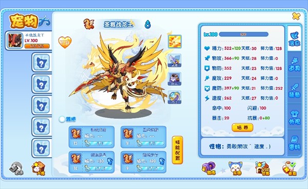 在信息界面中,能够查看当前宠物的各项基础能力数值,同时还能开展培养操作,像努力值的分配以及技能配置的调整等。