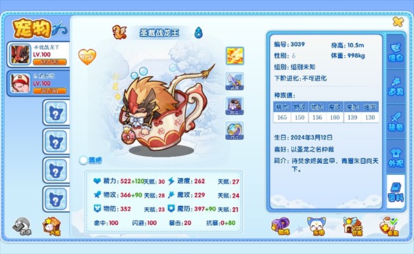 当鼠标悬停在宠物图标上,或者长按该图标时,就能快速查看宠物的亲密度、进化链、性格、属性优势、血脉天赋以及装备详情等信息。