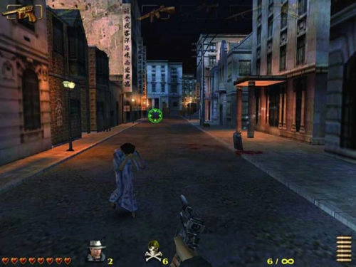 进入内庭,打死那些浪人后,服部千军又会出现,只能在他进攻时,按住开火键拼命射击,这样他就无法靠近你。要小心,有好几次转身时,服部千军会蹲在你面前发动攻击,只要你能立刻打到他,他就会自动后退一步。