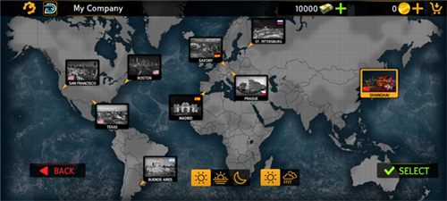3、挑选你想去的地区,游戏内设有各类现实中的城内与城外地图,包括美国(旧金山、德克萨斯)、南美洲(布宜诺斯艾利斯)、欧洲(德国、西班牙、布拉格、圣彼得堡)、迪拜、上海等。并且,你还能在下方选择当前地区一天内的多个时间以及不同天气条件,点击“SELECT”即可。