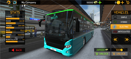 5、挑选一辆最契合自身需求的车辆,游戏中设有多种类型的巴士供你选择,包括常规/柴油巴士、混合动力巴士、电动巴士以及铰接式巴士,每类公交车的属性皆有所差异。