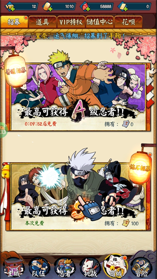 5、每天都能免费进行一次忍者招募,有几率获得强力伙伴。
