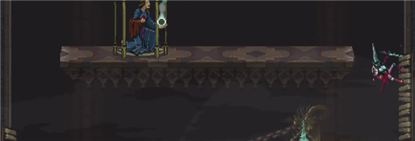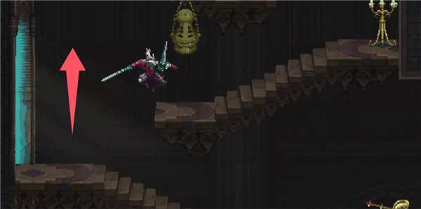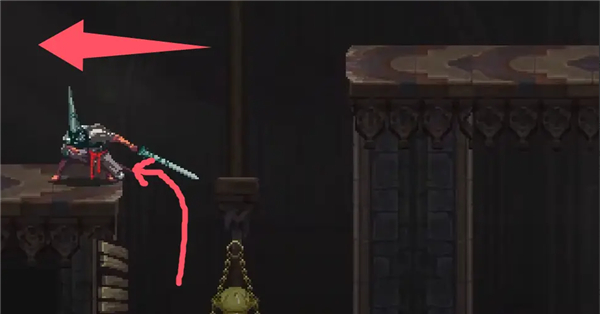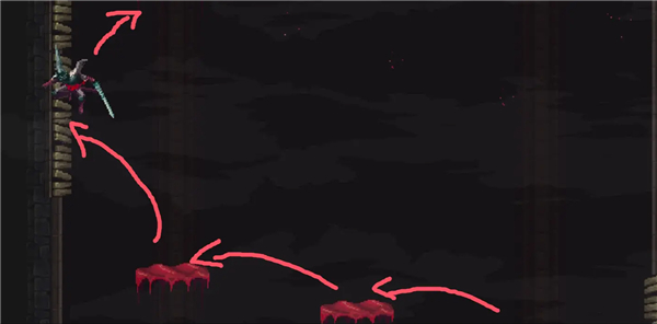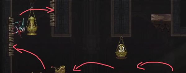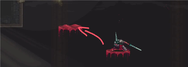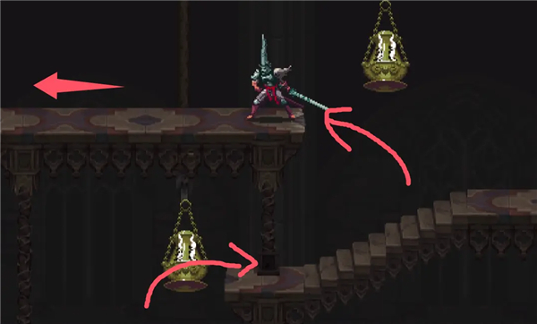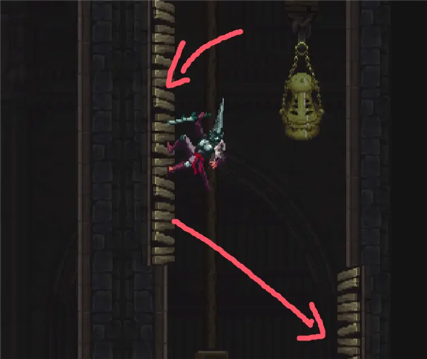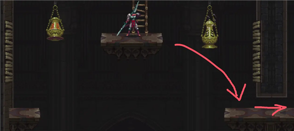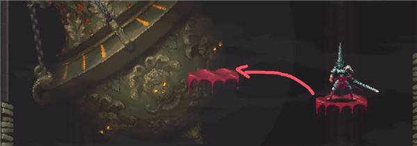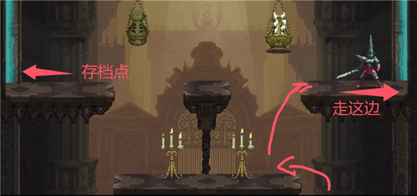 ②先跳到香炉下方的平台,接着往左边跳,开启通往存档点的捷径。要是血量不足,就回去存档,不过之后仍需回到这条捷径所在之处。