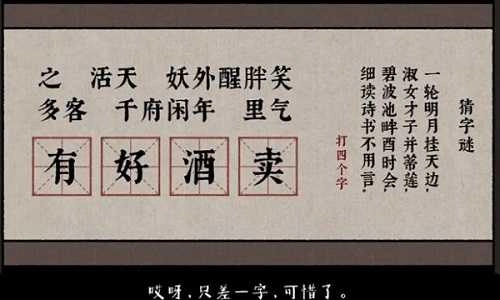 5、前往【春风楼】,参与猜字谜【有好酒卖】。(在左侧句子中,将这4个字拖至下方方框。)