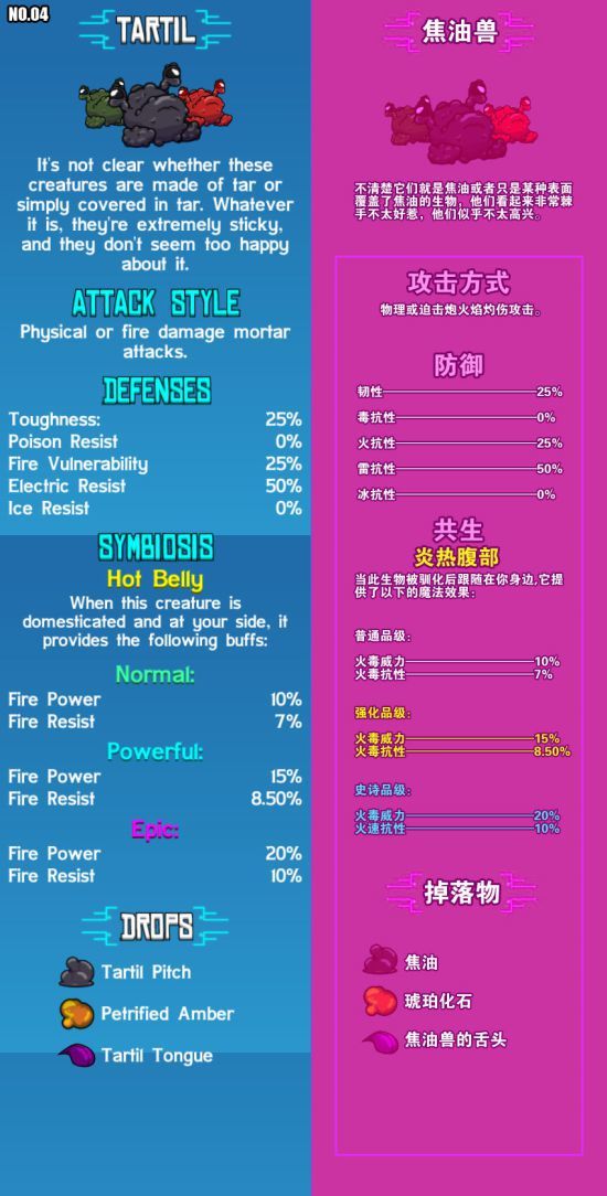 崩溃大陆第一世界的生物里,有个焦油兽,它常年栖息在沼泽周边,玩家一般在第一世界的中后期会与之接触。焦油兽的攻击手段是发射火球,一旦锁定目标,就会向目标喷射火球,同时地面上会出现红色弹道作为示意。它的攻击方式主要有两种,其中一种是小范围的火球攻击,发动攻击后,地面会在一段时间内持续燃烧,处于该地点的玩家会遭到持续灼烧。