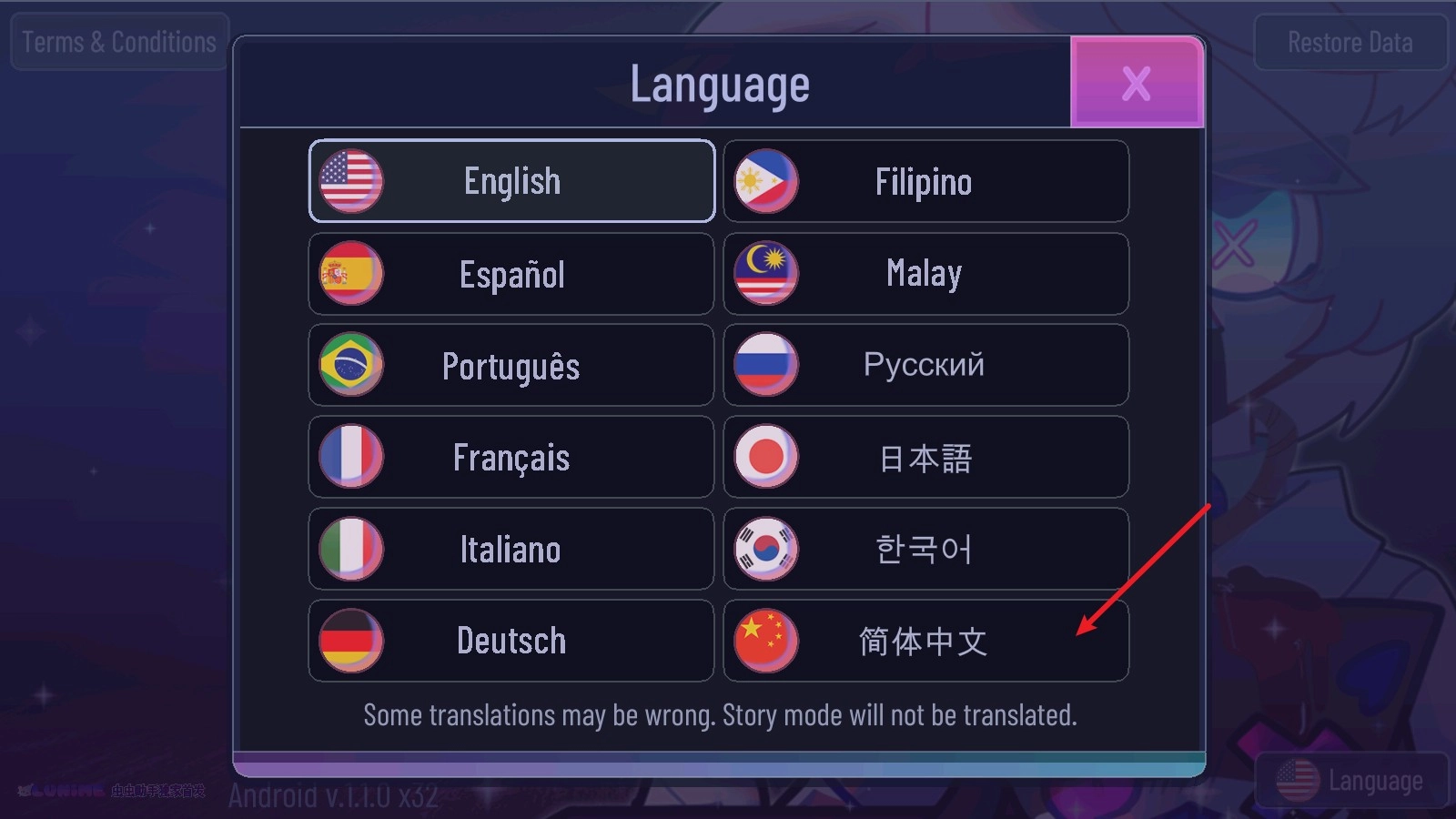 进入游戏前,我们在主界面的右下角点击language按钮。