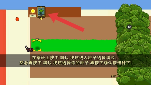 画面里能看到阳光数量的显示,植物卡片需要消耗300阳光,下方的文字提示说明,在草地上按下确认按钮就能进入种子选择模式,接着再按确认按钮就可以挑选种子并种下,同时还显示当前处于第1关。