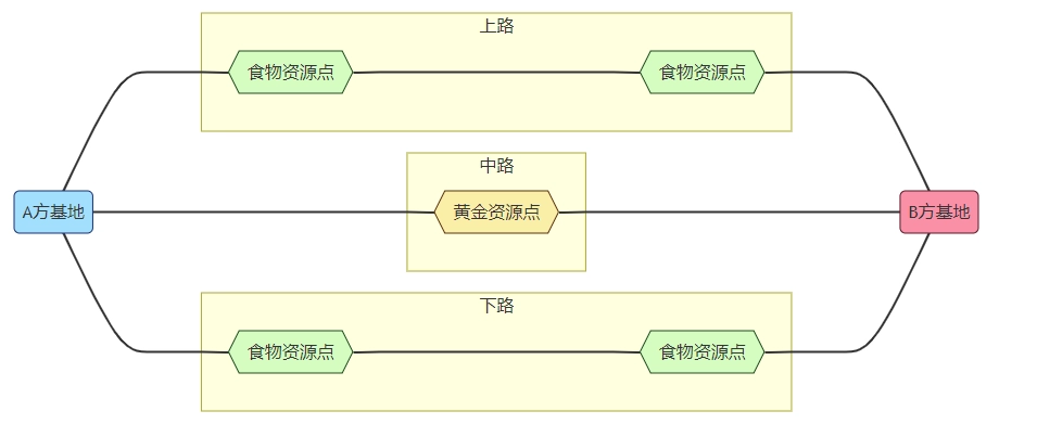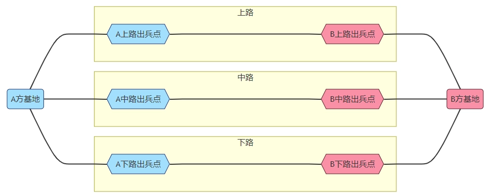 战场上不同的进攻路线被称作“路”。每条路的两端各自连接着双方玩家的基地,依据所处方位的差异,这些路被划分为上路、中路与下路。