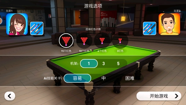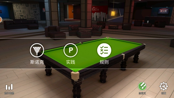 如下图所示,点击“斯诺克”选项就能开启比赛,点击“实践”选项则可进入训练模式。