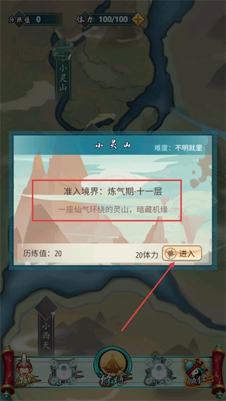 达到【炼气期·十一层】后,消耗【20】体力即可进入【小灵山】,在这座仙气氤氲的灵山之中探索,以获取隐藏的机缘。