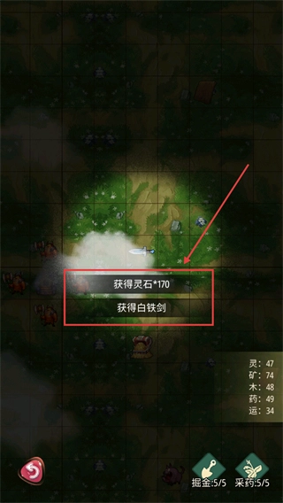 在探索途中战胜敌人,有概率得到【灵石】【170】和【白铁剑】,积攒这些资源与武器能为修真之路提供助力。