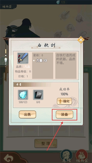 获得【白铁剑】后点击装备,它可以增加【13】点力量属性,从而提升角色的战斗能力,以应对接下来的挑战。