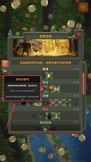 在世界法则界面调整【和谐】-【外交】-【文明】等相关规则,打造专属世界,开辟独特的发展轨迹。