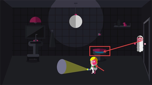 等那个拿着手电筒的角色坐到马桶上时,操控【白色幽灵】径直跳出来吓唬坐在马桶上的【黄头发小男孩】。