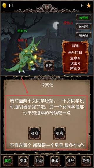 在战斗过程中,如果触发了【冷笑话】弹窗,只要选择【哈哈】或者【噢噢】这两个选项,就能获得星星,这些星星可以用来进行后续的资质提升。