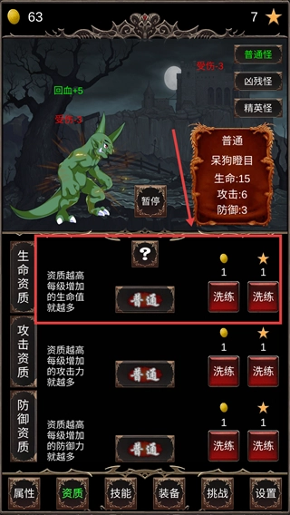 点击【资质】界面中的【洗练】按钮,通过消耗资源来提升生命、攻击等资质,从而增加每级属性的成长幅度。