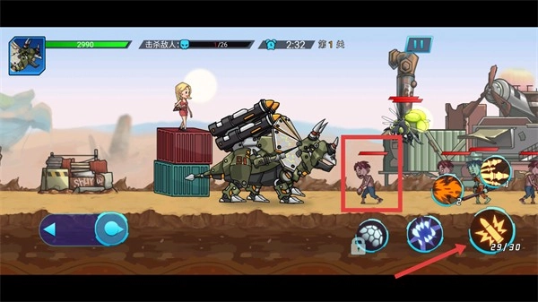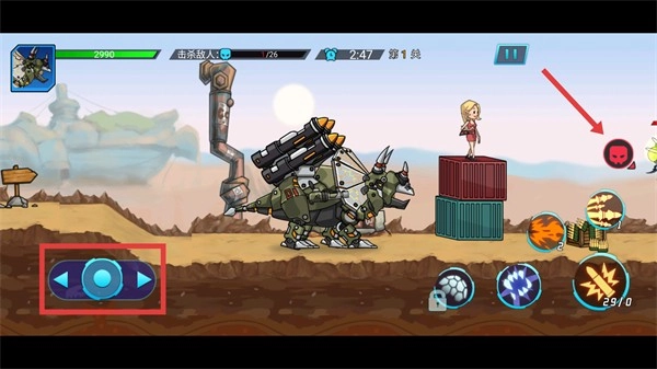 操控机甲靠近红框内的敌人后,点击右侧技能图标发起攻击,推进关卡进度。