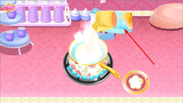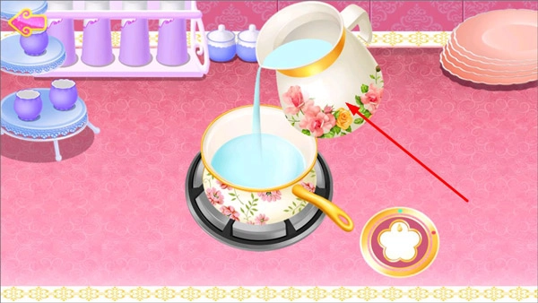 进入厨房界面后,第一步要根据提示将水壶中的水倒进锅里。