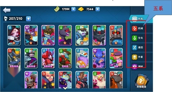 目前在《不休战队》里,玩家通过完成任务和抽卡获取的英雄主要划分为五系两大类。其中五系具体是机械系、生化系、基因系、神秘系与外星系;而每个系别的英雄又可简单分为狗粮和非狗粮两类。