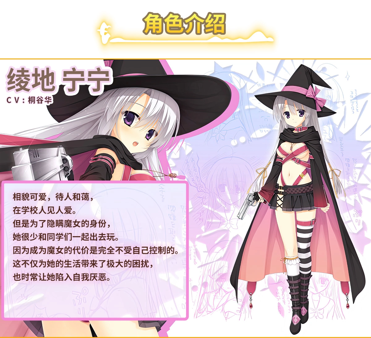 她长相甜美可人,且十分擅长与人打交道,在学院内人气颇高。只是因为心底藏着身为魔女的秘密,所以平日里很少和他人多交谈。