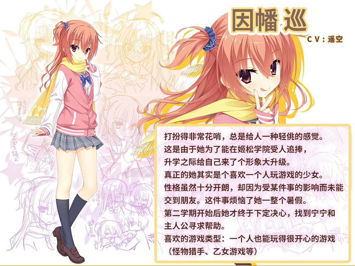 她打扮得色彩艳丽、样式花哨,看起来带点轻佻的感觉,但这仅仅是她在姬松学院初次登场时的模样。实际上她是个热衷于玩游戏的少女,性格爽朗又坦率,不过因为某件事导致她在交友上遭遇了挫折,这件事让她整个夏天都闷闷不乐,最后她下定决心向主人公们寻求帮助。