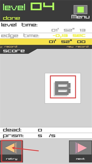 通关后可以查看【level-time】等相关数据,要是想要优化成绩,点击【retry】按钮就能重新游玩。