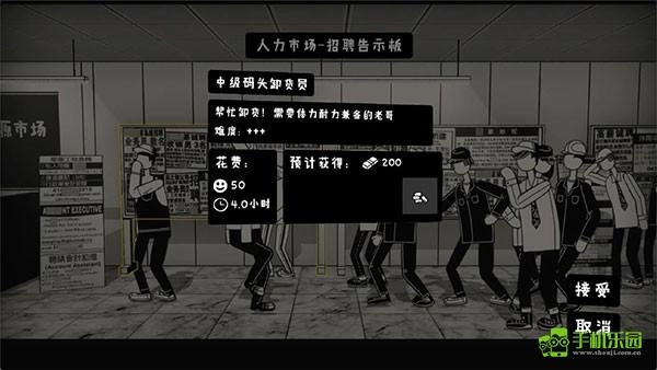 玩家得去游戏里的人力市场接各种打工小游戏来做;这些打工小游戏在耗时长短、难度高低和报酬多少上都不一样,所以玩家得好好挑一挑;要是去得晚了,人力市场里那些不错的日结工作可就没啦。