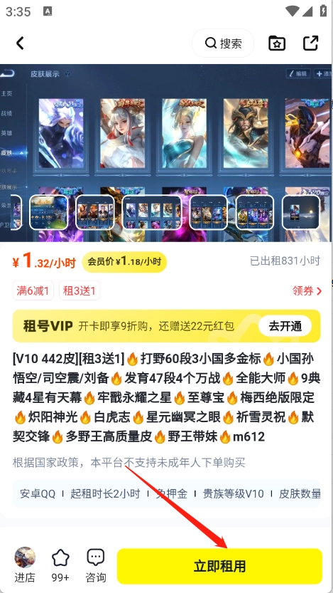 玩家在选定想玩的游戏账号后进入详情页面,接着点击“立即租用”按钮。