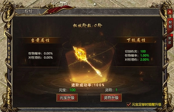 首先为大家介绍权杖法器,它的阶数总共划分为20阶,核心的攻击属性包含切割伤害加成、怪物爆率加成以及对怪物的增伤加成。升级权杖法器时,既可以消耗一定数量的元宝,也能够通过消耗相应的灵符来完成升级操作。值得注意的是,随着提升的阶数等级不断增高,进阶成功的概率会逐渐降低。