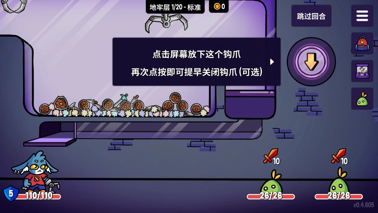 在地牢关卡里,玩家需要通过滑动操作把【钩爪】拖到目标区域,精准抓取道具或敌人,这是推进关卡进度的关键操作。