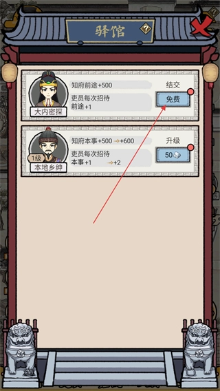 进入驿馆界面后,点击免费按钮结交大内密探,可提升知府前途以及吏员的招待属性。
