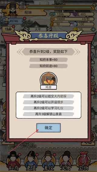 升级完成后会弹出恭喜升级的界面,届时可领取知府本事+80等奖励,点击确定即可关闭该界面,后续升级还将解锁更多内容。