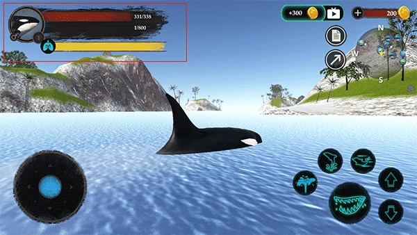 左下角的虚拟摇杆负责操控移动方向,右下角的动作按键则可完成喷水、跃出水面、发起攻击等动作,通过灵活配合这些操作,就能充分展现虎鲸的敏捷身姿与强大力量。