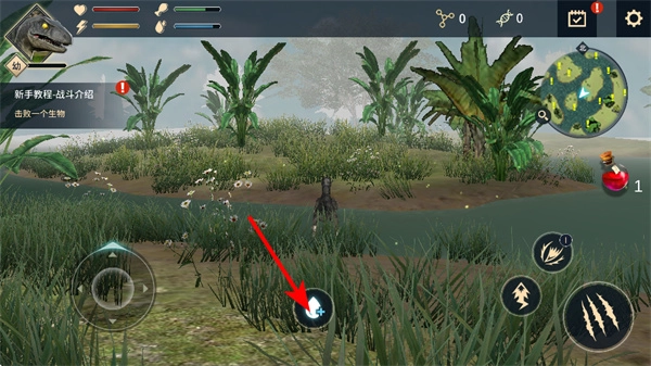 2、拖动左下角的摇杆能够操控恐龙移动,移动过程中要留意场景里的地形与资源分布情况,合理规划移动路线,以便更高效地进行探索或者躲避危险。