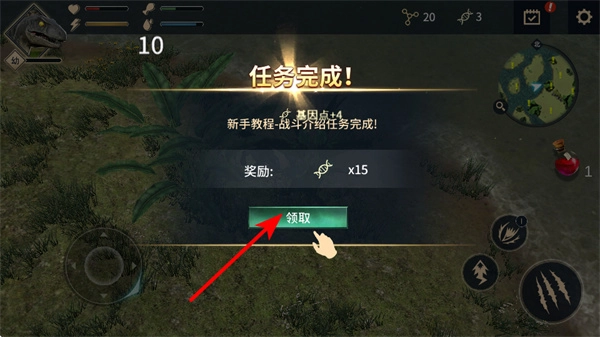 4、完成新手教程等任务后,点击“领取”即可获得货币等奖励;领取后积累这些资源,可用于恐龙进化或技能升级。