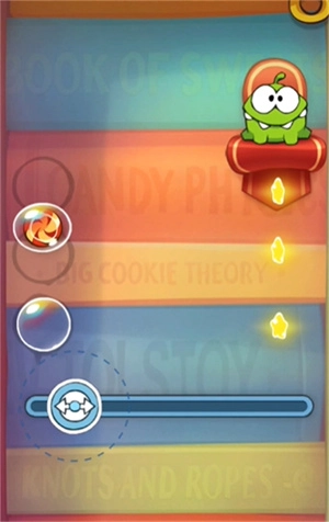 这个糖果只要碰到泡泡就会立刻上升,你可以用手指把它戳破。