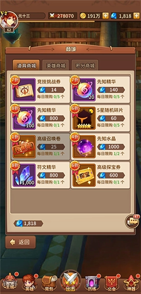 除了首次的钻石十连抽之外,精灵商店里性价比颇高的商品还有:500钻石的先知水晶(获取概率较低)、300钻石的10张探宝券、20000金币的探宝券,以及10000金币的竞技场挑战券,这些都是值得入手的不错选择。