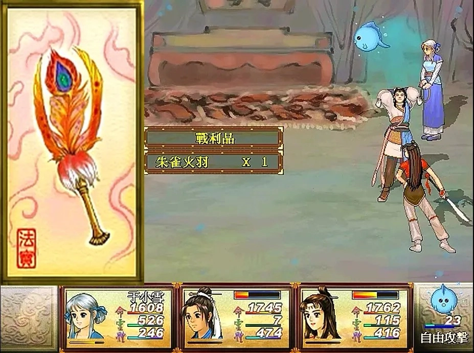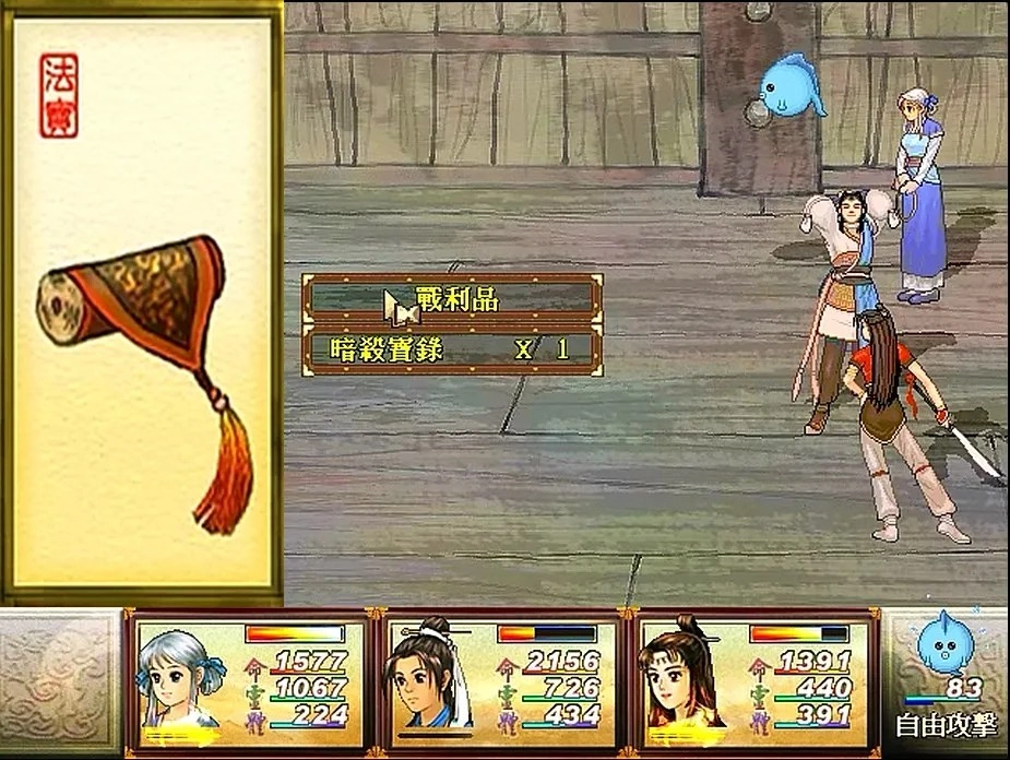 这是游戏里的第二件法宝,藏在月河村客栈最里面,是个彻头彻尾的隐藏法宝。把它当成游戏最强法宝也说得过去,只要一直戴着升级,后期角色几乎不用带武器,法术之类的也不用放了。再配上F8用,每回合都能打出最高伤害。